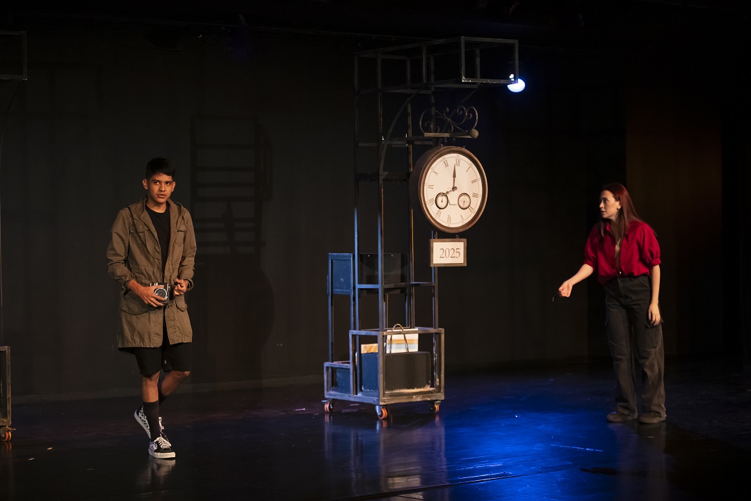 En el escenario de Cronémica de dos vidas el tiempo no es solo tema, es materia visible. Un gran reloj suspendido en estructuras metálicas móviles preside la escena como si fuera el corazón del espacio. Cada desplazamiento de esos andamios con ruedas, cada cambio de luz, parece ajustar las manecillas de una maquinaria secreta que organiza el relato. Con este espectáculo, Dioniso Compañía Artística cierra la temporada 2025 del Teatro Luis Poma y propone algo más que una historia: un encuentro sensible sobre cómo habitamos el tiempo y cómo el teatro puede volverlo experiencia compartida.