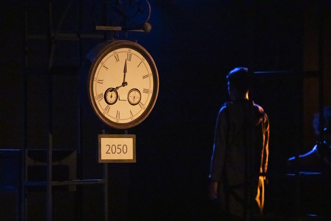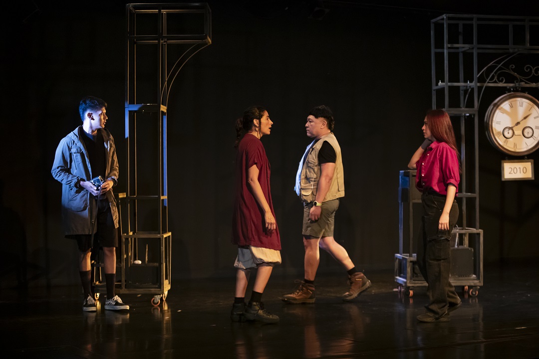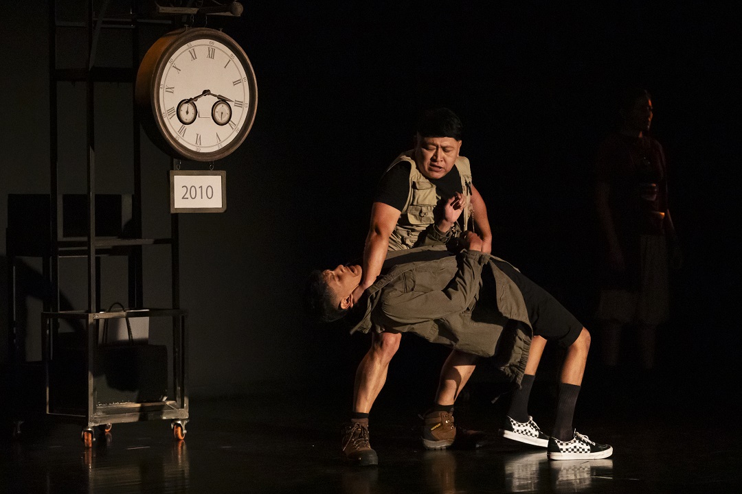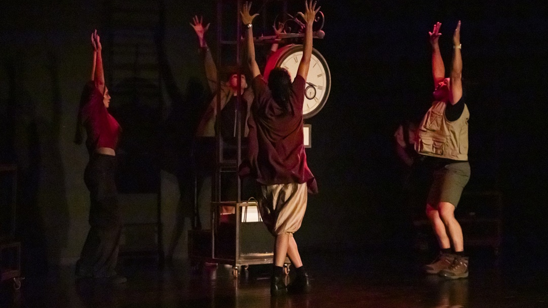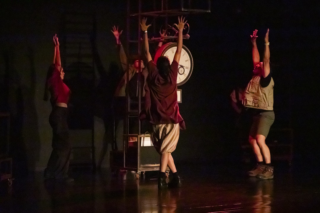 La puesta en escena aprovecha esa sincronía. Las estructuras metálicas se desplazan y configuran distintos espacios –habitación, parada de bus, el interior del reloj– sin necesidad de naturalismo. La dirección física de Roberto Cardona enfatiza la dimensión coreográfica del movimiento. Hay algo casi dancístico en la forma en que Cecilia joven es arrastrada hacia el pasado o en ese gesto en que César adulto detiene a su doble más joven, como si quisiera protegerlo de sí mismo. El cuerpo sigue siendo, como en otros trabajos de Dioniso, un medio expresivo central, capaz de decir lo que la palabra no alcanza, de encarnar deseos, miedos, culpas.
