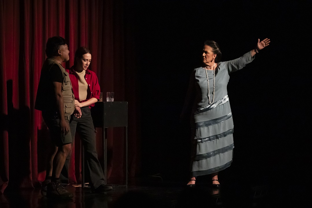 Uno de los aciertos del espectáculo está en el elenco y en el diálogo generacional que propone. Regina Cañas, Paola Miranda y César Pineda trazan un primer camino, el de actrices y actores consagrados de la escena salvadoreña, cuya experiencia se siente en la precisión del gesto, en la forma de sostener los silencios, en la naturalidad con que transitan del humor a la grieta emocional. A su lado, Maru Gálvez, Luis Callejas, Neto González y Mariam Santamaría inscriben la vitalidad de una nueva generación. No hay ruptura, hay puente. Los estilos de actuación se encuentran en una cadencia común: las entradas y salidas se engranan con exactitud, los diálogos cruzados fluyen, las escenas corales funcionan como una partitura donde cada cuerpo sabe cuándo avanzar, cuándo contenerse.
